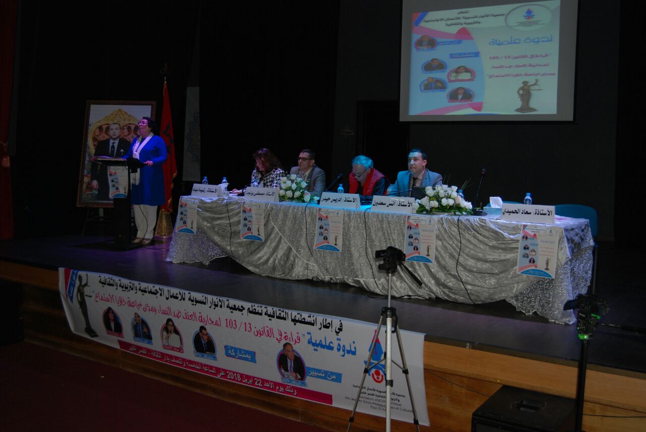 نظمت جمعية الأنوار النسوية للأعمال الاجتماعية والتربوية والثقافية،ندوة علمية تحت عنوان:”قراءة في القانون 103/13 لمحاربة العنف ضد النساء ومدى نجاعة خلايا الاستماع ” وذلك يوم 22ابريل 2018 بدار للثقافة بالقصر الكبير.