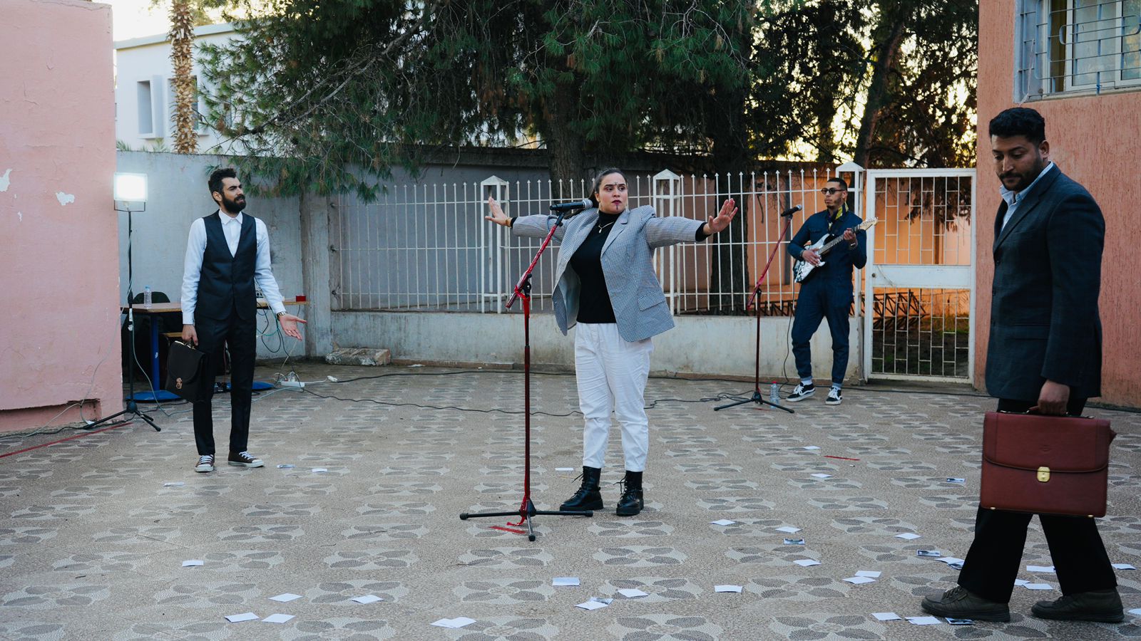 تبدأ المسرحية بأسلوب غير تقليدي، وبمشهد بصري غير مألوف، لا إظلام، لا ستارة ترفع، بل مشهد تُرسم ملامحه عبر الأداء، فمنذ اللحظة الأولى، لا تتوسل المسرحية سلطة الخشبة المغلقة، بل تقتحم الوعي الجمعي بصيغة خطاب مباشر، تصدح سكينة جعطيط (المقدمة) بصوتها في الفراغ، معلنة بداية العرض، بينما الموسيقي (عبد السلام الحمداني) يعزف على القيثارة، أما الممثلان (وليد المعروفي ومعتصم واسوا)، فيقفان فوق سطح بناية، كأنهما في انتظار لحظة الهبوط، في حالة من الترقب المعلق بين العلو والانخفاض، بين العزلة والرغبة في الانخراط، يأتي صوت الممثلة كدعوة للجمهور، وتبدأ المسرحية بتحطيم الجدار الرابع بين الممثلين والجمهور، فلا فاصل بين من يؤدي ومن يشاهد، بل هناك دعوة مباشرة للحضور في المشهد، ليس بوصفهم متفرجين، بل بوصفهم جزءًا من الفعل المسرحي ذاته، تبدأ المقدمة: “مرحبا بيكوم معانا… ليوم جبنا ليكوم فراجة… غانتفرجو فيكوم او غاتفرجو فينا… غانشكيو عليكوم همنا او غاتشكيو علينا همكم…” (مرحبا يسون أكيدنخ… أسا نداد غيرون سرلفراجت… ذانفرج ديكون ترفجم ذيكنخ… أنشكو غيفون الهم نخ تشكوم غيفنخ الهم النون…)