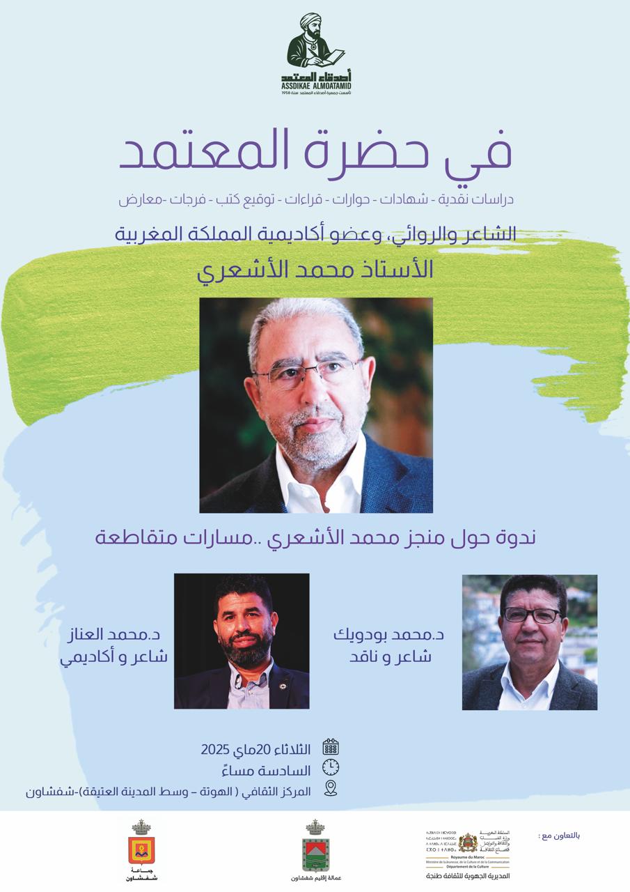 تستضيف جمعية أصدقاء المعتمد الشاعر والروائي وعضو أكادمية المملكة المغربية الأستاذ محمد الأشعري يوم الثلاثاء 20 ماي 2025 ، في لقاء متميز، يؤثثه ثلة من النقاد والباحثين العارفين، ليفتح مع هذا الضيف المتميز نوافذ كثيرة من مساره البارز والمثقل بالتجارب الثقافية ،وهو الذي سبر أغوار الشعر والرواية والتدبير الثقافي المؤسسي والجمعوي .