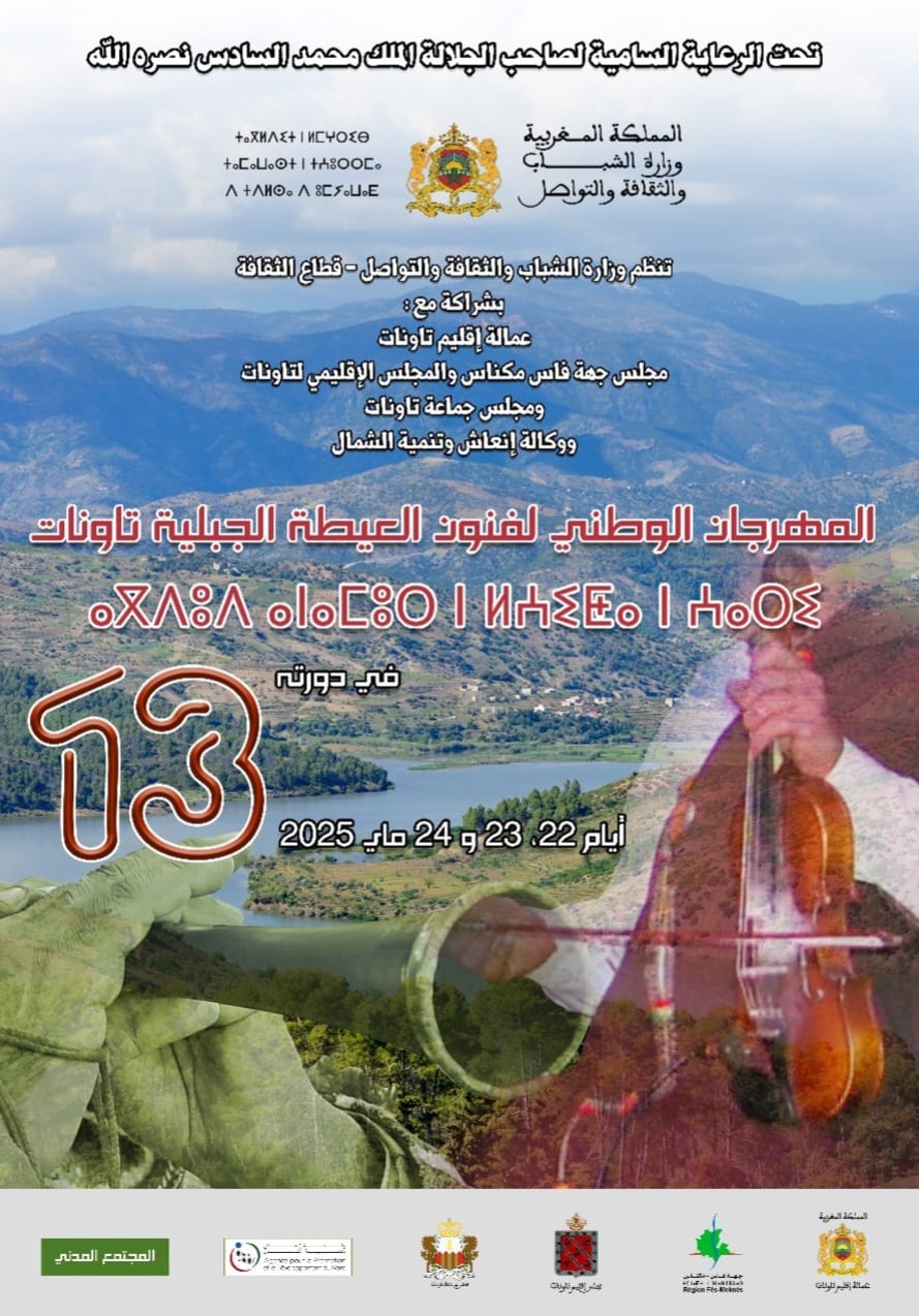 تنظم وزارة الشباب والثقافة والتواصل – قطاع الثقافة- بشراكة مع عمالة إقليم تاونات ومجلس جهة فاس مكناس، والمجلس الإقليمي لتاونات، ومجلس جماعة تاونات، ووكالة إنعاش وتنمية الشمال، الدورة الثالثة عشرة للمهرجان الوطني لفنون العيطة الجبلية أيام 22-23- 24 ماي 2025، بمدينة تاونات، وذلك تنفيذاً لإستراتيجيتها الرامية إلى إبراز تنوع الموروث الثقافي والفني المغربي عامة، ومنطقة جبالة خاصة.