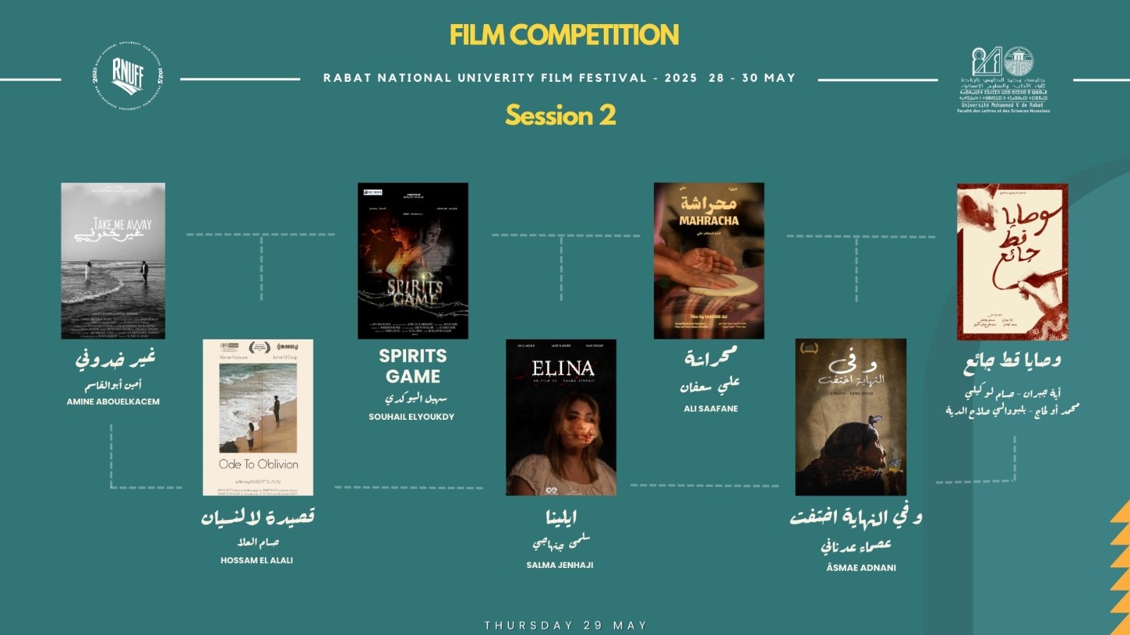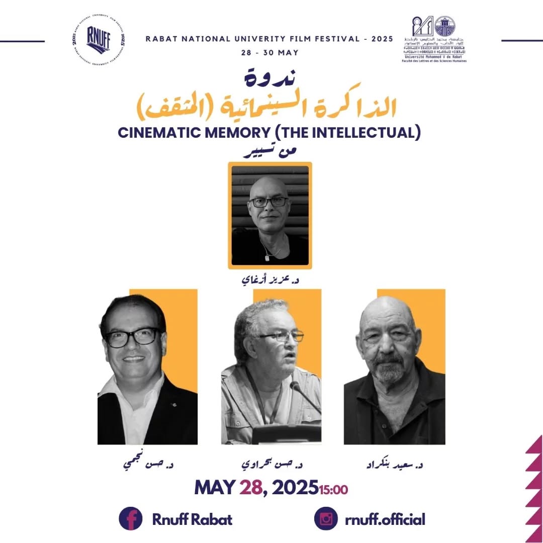 تفتتح أنشطة الدورة الأولى لمهرجان الرباط الوطني للفيلم الجامعي صباح الأربعاء 28 ماي الجاري بمدرج الشريف الإدريسي بكلية الآداب والعلوم الإنسانية، التابعة لجامعة محمد الخامس، وتختتم في نفس المدرج مساء الجمعة 30 ماي 2025، وذلك وفق البرنامج التالي: