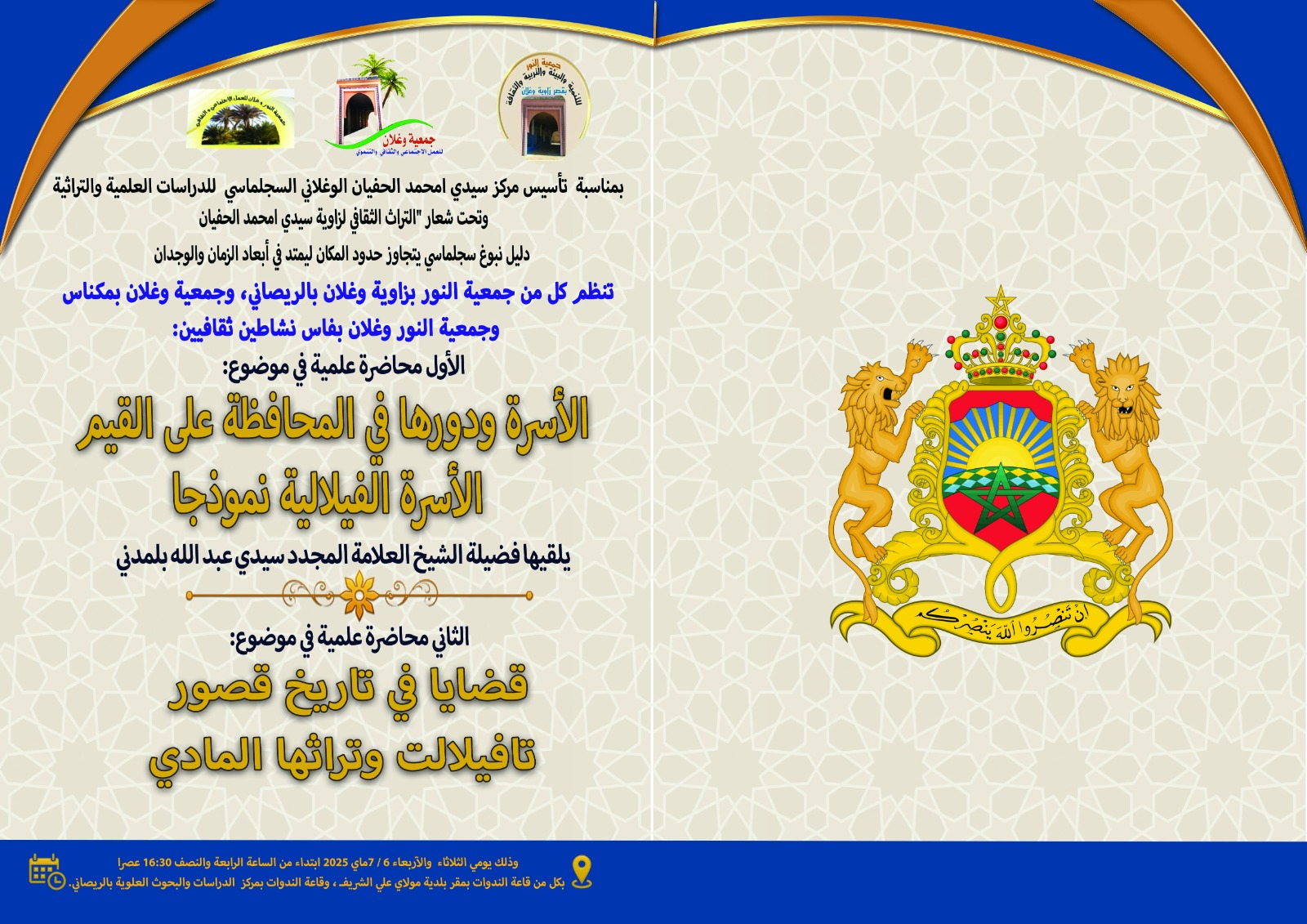 احتضن مدرج المركب الثقافي التابع لمركز الأبحاث والدراسات العلوية بالريصاني يوم الأربعاء 7ماي 2025 ندوة علمية في موضوع: قضايا في تاريخ قصور تافيلالت وتراثها المادي نظمتها كل من جمعية النور بزاوية وغلان بالريصاني، وجمعية وغلان بمكناس، وجمعية النور وغلان بفاس؛ وذلك بمناسبة تأسيس مركز سيدي امحمد الحفيان السجلماسي للدراسات العلمية والتراثية، وتحت شعار: “التراث الثقافي لزاوية سيدي امحمد الحفيان دليل نبوغ سجلماسي يتجاوز حدود المكان ليمتد في أبعاد الزمان والوجدان“، وقد أطر الندوة ثلة متميزة من الدكاترة والأساتذة الباحثين من جامعات مغربية متعددة، وتكونت من جلستين علميتين، ترأس الجلسة العلمية الأولى التي كانت موسومة بتنوع التراث الفيلالي: قصور في الواجهة الدكتور الحاج موسى عوني أستاذ التعليم العالي بكلية الآداب والعلوم الإنسانية سايس بفاس، وتنوعت مواضيعها وقضاياها بين مناقشة الأنشطة الاقتصادية بقصور ما بعد سجلماسة وتأثيراتها الاجتماعية في بعض القصور، كقصر تابوعصامت مثلا، والعلاقات بين مكونات المجتمع القبلي بواحة تافيلالت زمن الحماية، آيت خباش وذوي منيع مع أهل الغرفة أنموذجا، ثم إضاءات حول قصر زاوية وغلان من خلال مستويين اثنين: يتعلق الأول بالدور الديني والعلمي للزاوية الحفيانية بوغلان، ويتعلق الثاني بالتراث المخطوط لهذه الزاوية الحفيانية الذي يعبر عن ريادتها العلمية والثقافية داخل قصور تافيلالت.