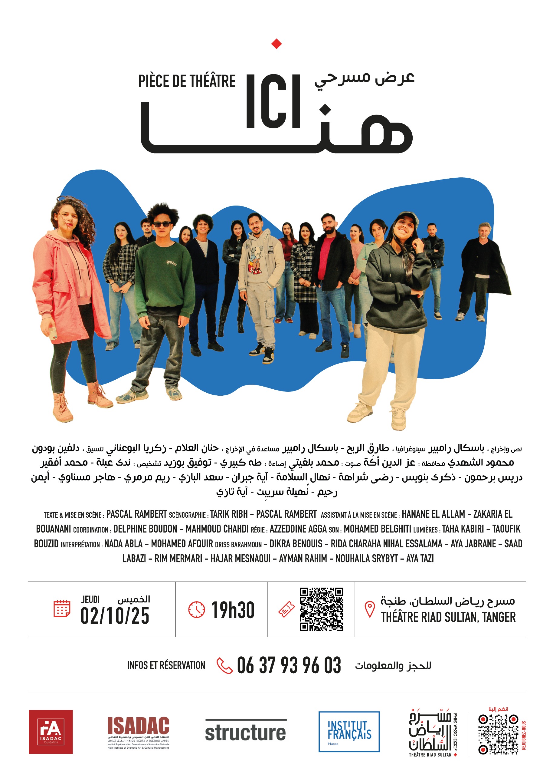 يستهل مسرح رياض السلطان موسمه الثقافي الجديد يوم الخميس 2 أكتوبر، على الساعة السابعة مساءً، بعرض مسرحية “هنا”، وهي من نص وإخراج باسكال راميير، سينوغرافيا طارق ربح.. بشراكة مع المعهد العالي للفن المسرحي والتنشيط الثقافي، المعهد الفرنسي بالمغرب.