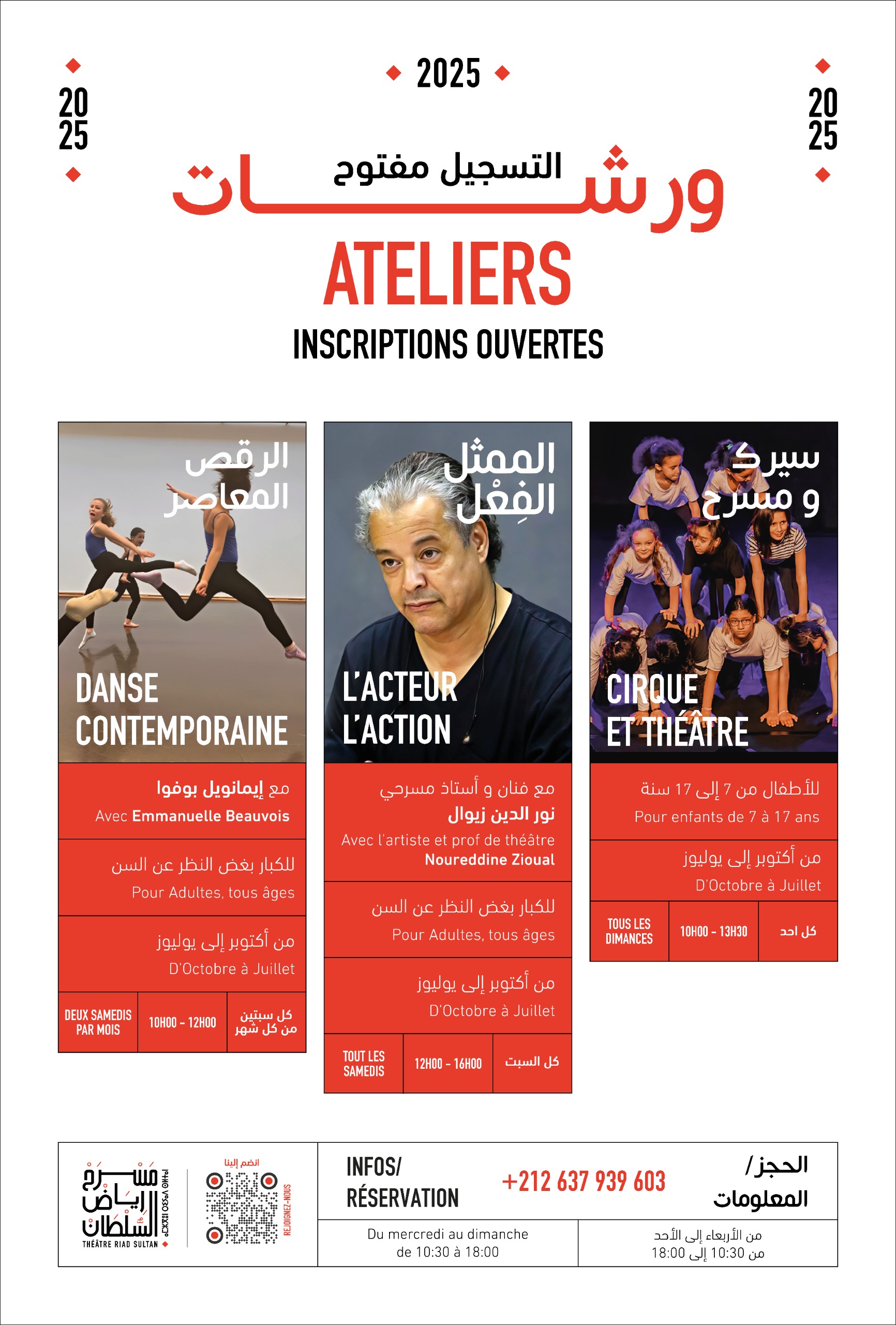 ورشات المسرح للكبار، في إطار الموسم الأول من تكوين “ممثل/فعل”. تُنظَّم الورشات كل يوم سبت، من الساعة الثانية عشرة زوالًا إلى الرابعة بعد الزوال، وذلك من أكتوبر إلى يوليوز.بتأطير نور الدين زيوال،ممثل، مخرج مسرحي، وباحث في مجالات الممارسة المسرحية وفنون العرض.حصل على دبلوم الدراسات العليا الأساسية سنة 2008، وتخرّج سنة 1992 من المعهد العالي للفن المسرحي والتنشيط الثقافي، بتخصص في التمثيل.شغل بين سنتي 2013 و2017 منصب نائب مدير ومدير الدراسات بالمعهد العالي للفن المسرحي والتنشيط الثقافي، كما تولّى خلال نفس الفترة منصب الكاتب العام للنقابة المغربية لمحترفي الفنون الدرامية.عمل أستاذاً لمادة التمثيل بالمعهد العالي للفن المسرحي والتنشيط الثقافي من سنة 1992 إلى سنة 2017، وهو عضو مؤسس لفرقة “الضفة الأخرى” المسرحية منذ عام 1994.