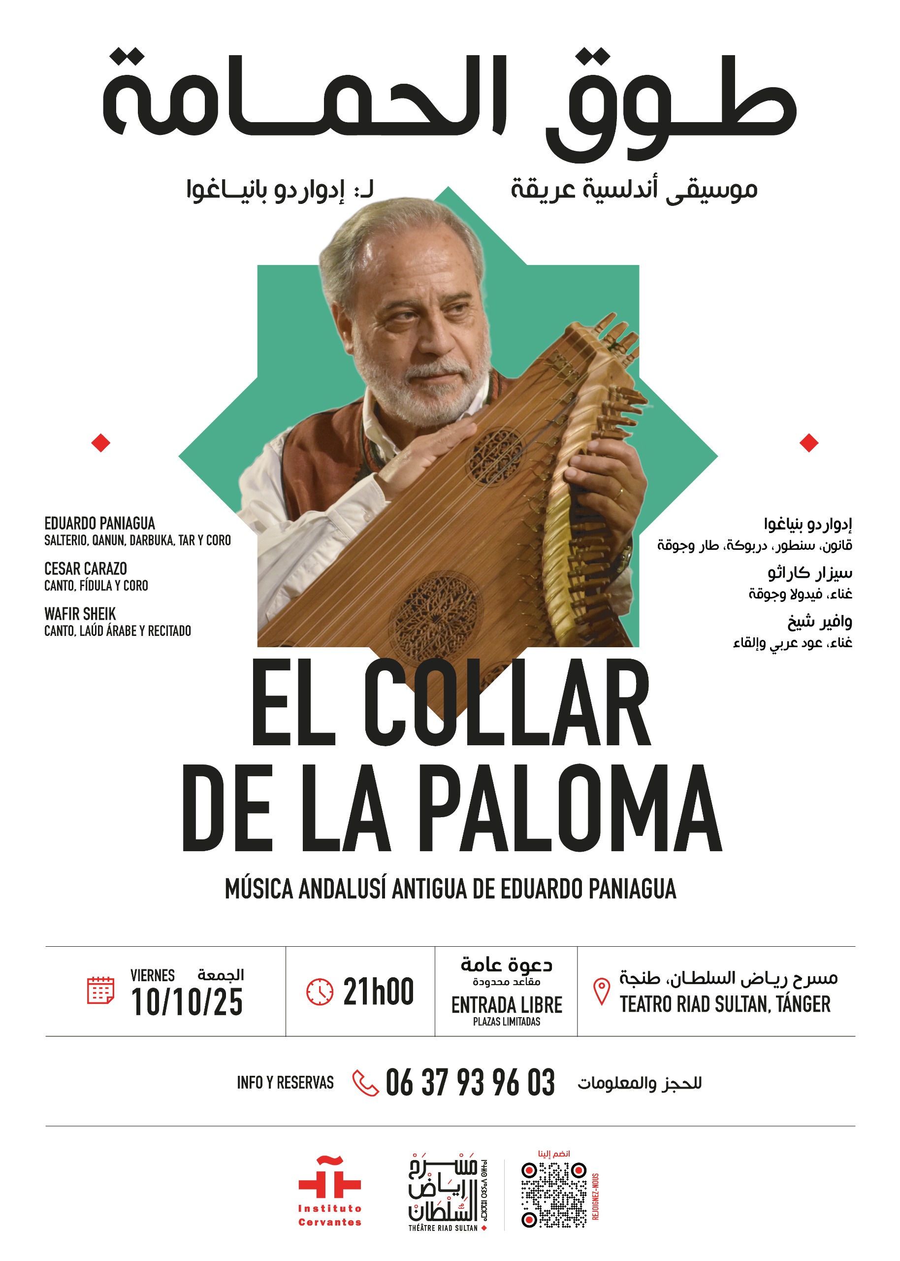 ويسافر بنا برنامج هذا الشهر، يوم الجمعة 10 أكتوبر على الساعة التاسعة مساءً، إلى عالم الموسيقى الأندلسية العريقة بحفل طوق الحمامة ل: إدواردو بانيغوا عازف القانون، السانطور، دربوكة، طار وجوقة. سيزار كارثو، غناء، فيدولا وجوقة. وافير شيخ، غناء، عود عربي وإلقاء. بشراكة مع معهد سيرفانتيس.