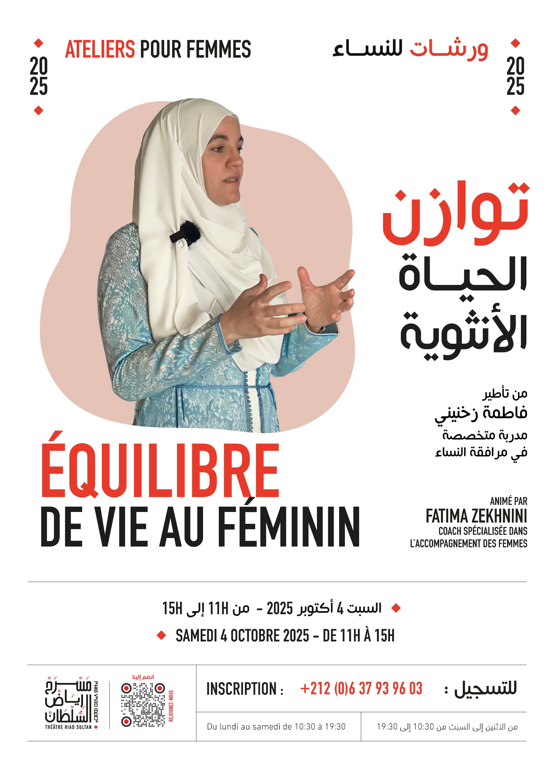 وفي إطار البرمجة المتنوعة لرياض السلطان، سيكون الجمهور على موعد يوم السبت 4 أكتوبر من الساعة الحادية عشر صباحا إلى الثالثة بعد الزوال مع ورشة توازن الحياة للمرأة، تتضمن تأمل ذاتي، تبادل خبرات وتمارين تطبيقية. من تأطير فاطمة زخنيني مدربة متخصصة في مرافقة النساء.