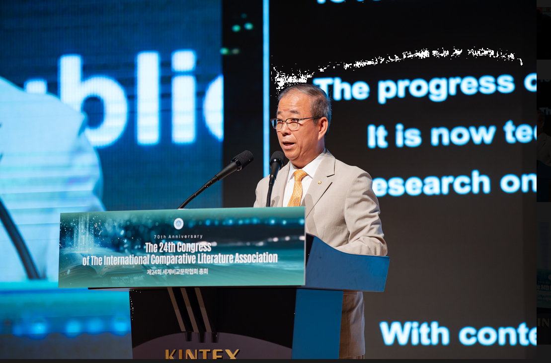 ربطت الرئيسة السابقة للرابطة الدولية للأدب المقارن الدكتورة بولدريني بين غنى وتنوع برنامج المؤتمر وسرعة تغير العالم الذي نعيش فيه (15)، وأكد رئيس المؤتمر الدكتور يونغمين كيم في المقابل أن موضوعه يمثل مرحلة حاسمة في دراسات الأدب المقارن، تشكلت بفضل التقارب بين الأدب العالمي والعلوم الإنسانية الرقمية والفن عبر الوسائط(16)، مُشدِّدا على ضرورة المزاوجة في إطار الدرس المقارن بين الدراسة الأدبية المقارنة والدراسات متعددة التخصصات. يقول في هذا الصدد : ” نحن مدعوون، في عصر التطور التكنولوجي السريع هذا، إلى إعادة النظر في دور الأدب ليس فقط كمستودع للذاكرة الثقافية، بل كواجهةٍ ديناميكية بين الإدراك البشري والذكاء الآلي، بين الشعر والخوارزميات. وفي الوقت نفسه، يؤكد هذا المؤتمر على الأهمية الدائمة للأساليب الأساسية للأدب المقارن، وهي القراءة المتأنية، والسياق التاريخي، والتحليل عبر الثقافات. وبدلاً من استبدال هذه التقاليد، تدعونا التكنولوجيا إلى توسيعها وإعادة صياغتها. ويحثنا التحول الرقمي على التفكير بشكل مقارن، ليس فقط عبر اللغات والثقافات، ولكن أيضًا عبر المنصات ووسائل الإعلام وأساليب إنتاج المعرفة “(17).