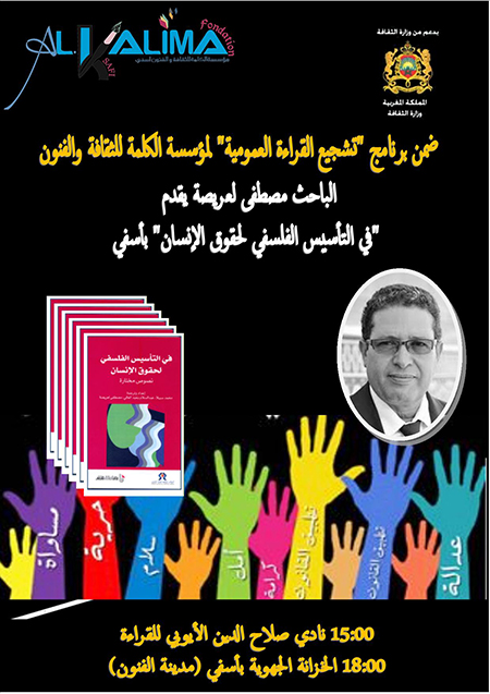 ضمن برنامج تشجيع القراءة العمومية لمؤسسة الكلمة الثقافة والفنون بأسفي وبدعم من وزارة الثقافة، تحتضن فضاء الخزانة الجهوية بأسفي يوم الجمعة 26 فبراير 2016 على الساعة السادسة مساء لقاء مفتوحا مع الباحث والحقوقي الدكتور مصطفى لعريصة حول كتاب "في التأسيس الفلسفي لحقوق الإنسان". الكتاب الذي يعتبر أحد صيغ التوعية على ثقافة حقوق الإنسان، من خلال تقديم نصوص "ترجمها واختارها فريق عمل متكامل يتكون من الأساتذة محمد سبيلا وعبدالسلام بنعبدالعالي ومصطفى لعريصة". ويتوخى الكتاب أن يكون لبنة في تشكيل الوعي بالأسس الفكرية لثقافة حقوق الإنسان لدى التلاميذ المغاربة على الخصوص.